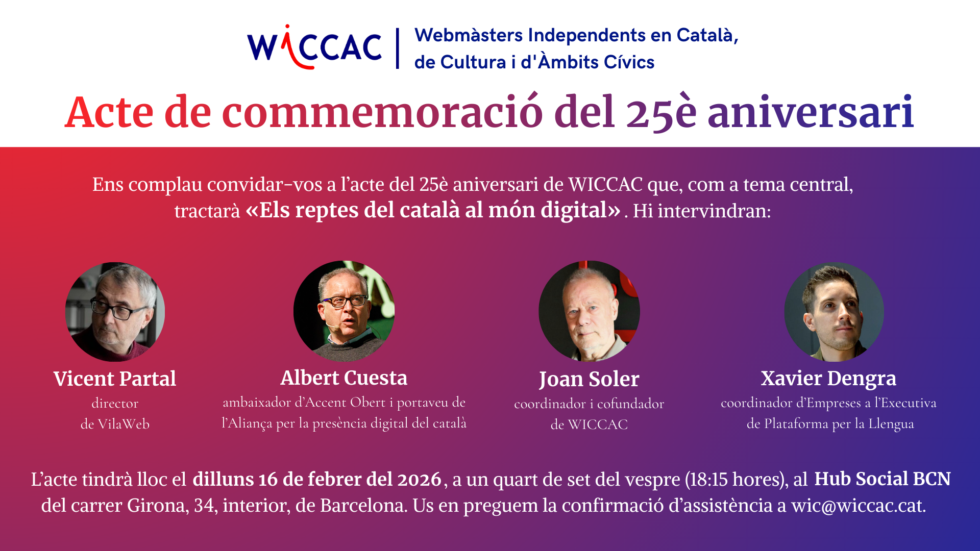 - Acte de commemoració dels 25 anys de WICCAC, dilluns 16 de febrer del 2026 al vespre, a la sala Hub Social BCN de Barcelona.